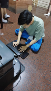 Pada foto di atas, saya terlihat sedang mengoperasikan laptop. Di momen itu, saya sedang membantu sie musik untuk mencari beberapa lagu transisi antar scene sehingga tidak flat atau monoton. Bagi saya, transisi bukan sekadar jeda, melainkan jembatan emosi. Jika salah memilih lagu, suasana bisa runtuh namun jika pemilihan lagu tepat, penonton bahkan tidak sadar bahwa mereka sedang berpindah adegan.